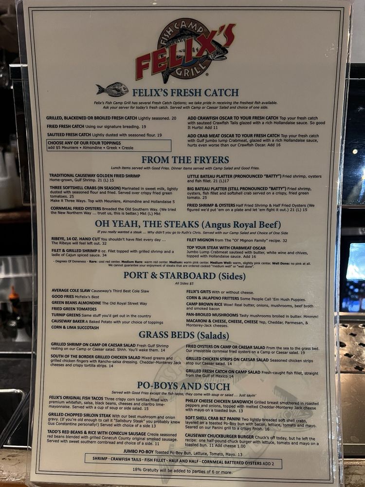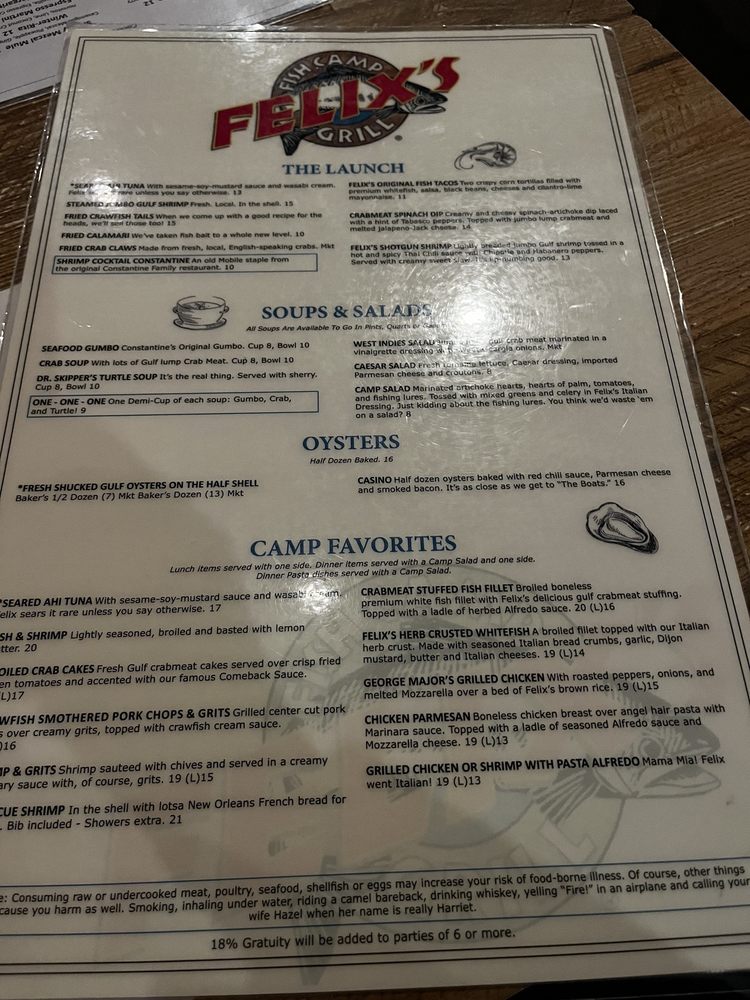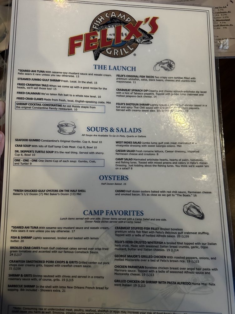 Located in Spanish Fort, AL, Felix's Fish Camp is a seafood diner offering a diverse menu with many vegetarian options. This restaurant is wheelchair accessible, with ADA-compliant facilities, including restrooms. You can enjoy outdoor seating, free Wi-Fi, and a full bar while dining here. Felix's Fish Camp also offers military discounts, private dining options, and catering services. The restaurant is open to all, including those with pets, and provides reusable tableware for environmentally conscious diners. With its convenient location and various amenities, Felix's Fish Camp provides a comfortable and enjoyable dining experience for everyone. Be sure to try their happy hour specials and drive-thru service for a quick and delicious meal.